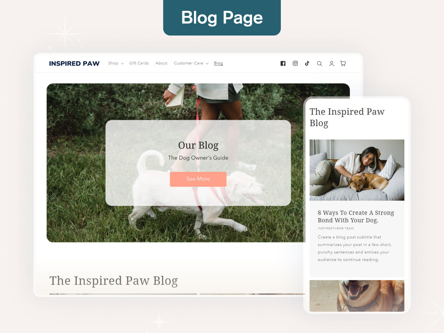 With a clean, cute, and modern design and a lot of customization options, Inspired Paw is a beautiful theme that is designed to help you convey your brand. Inspired Paw lets your products shine and help level up your business while remaining simple and clear. Easy to work with and adapts perfectly to whatever you're selling.